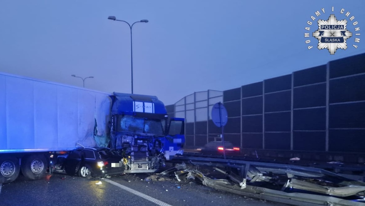 O krok od tragedii na A4; ciężarówka uderzyła w bariery, a w jej naczepę osobówka