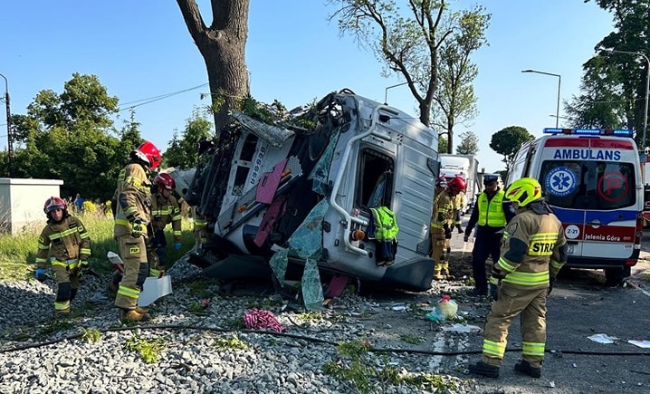 Na Dolnym Śląsku ciężarówka uderzyła w drzewo, kabina została zmiażdżona