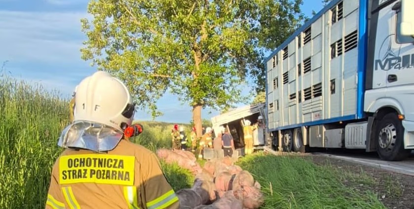 Nie dojechali do celu – świnie w rowie, kierowca ciężarówki i pasażer w szpitalu. Groźny wypadek w woj. pomorskim