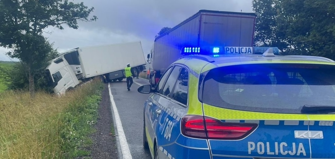Kierowca zestawu zjechał do rowu, by uniknąć czołówki. Prowadzący osobówkę… po prostu pojechał dalej