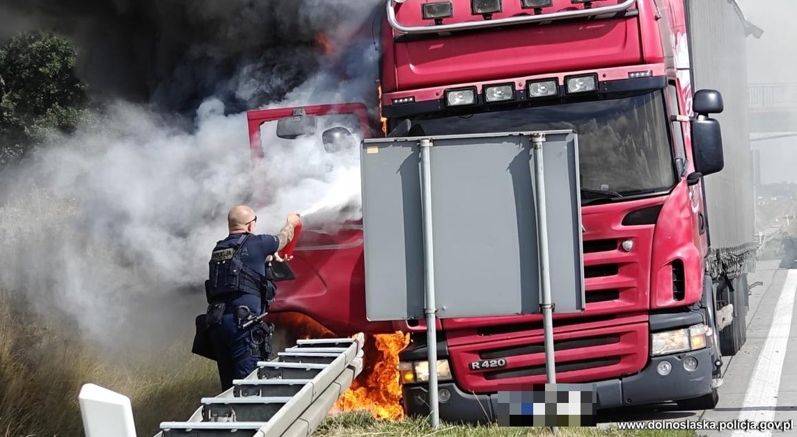 Na A4 legniccy policjanci zauważyli płonącą ciężarówkę stojącą na poboczu. Natychmiast przystąpili do działania....