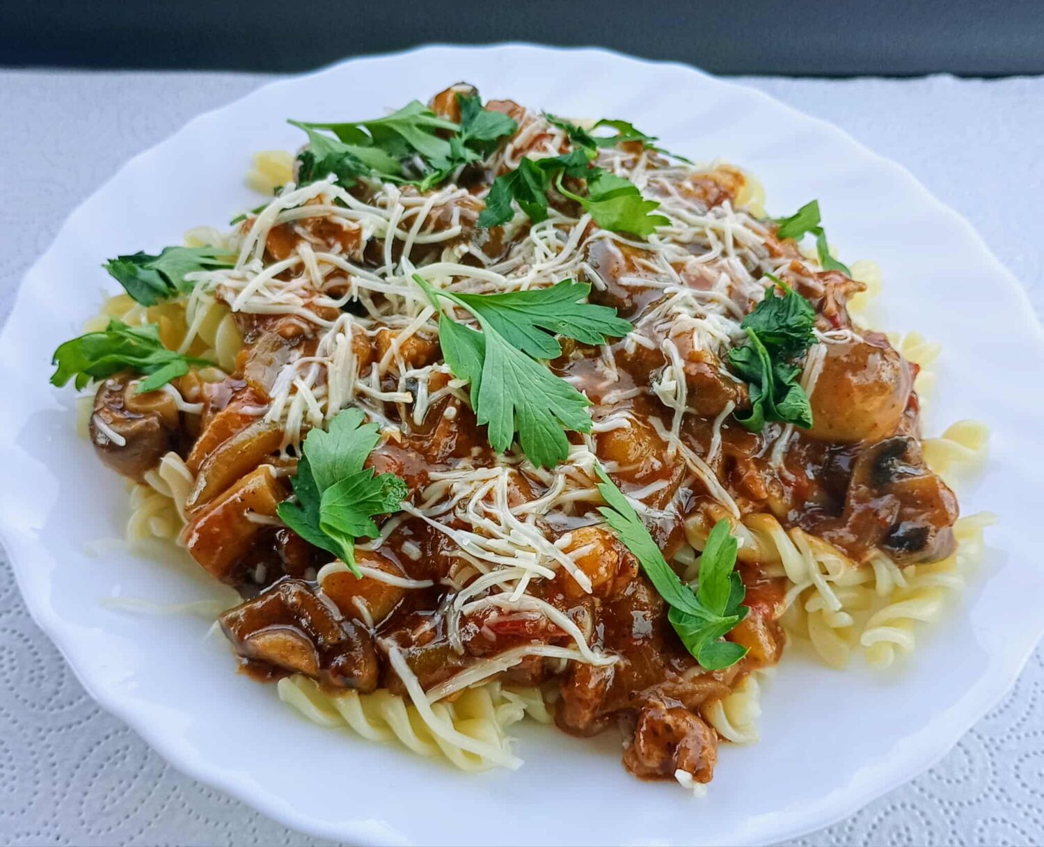 Bezmięsny „gulasz” serwowany z makaronem