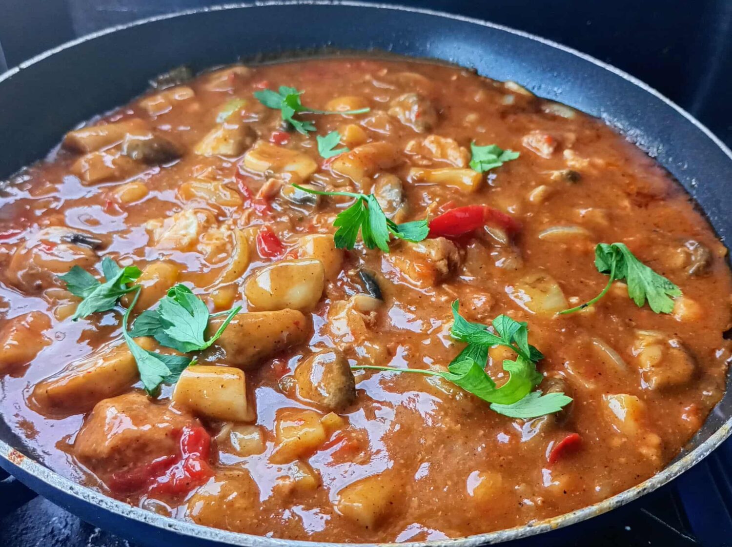 To coś pomiędzy gulaszem warzywno-pieczarkowym a szybkim sosem śmietanowo-paprykowym – więc jeśli lubisz kuchnię domową, lekko pikantną i treściwą, to zdecydowanie będzie Ci smakować. Czas przygotowania ok. 30 min i wychodzą z tego 3-4 porcje w zależności od apetytu.
