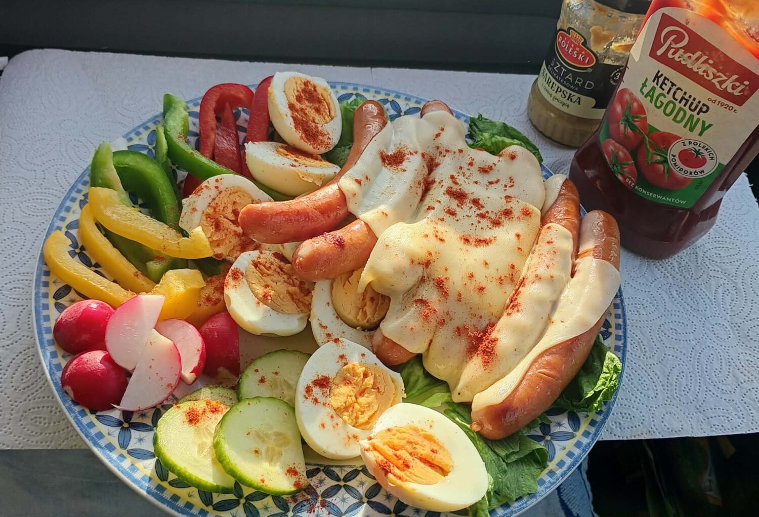 Chrupiąca kiełbaska, ciągnący się ser, do tego świeża, chrupiąca papryka i rzodkiewka. Jajko robi robotę, a ketchup i musztarda podkręcają...