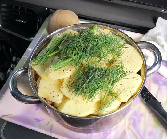 Przepis na 2-litrowy garnek. 1,5 kg ziemniaków, 2 kiełbasy śląskie, 2 większe cebule, sól, pieprz. Na dno garnka nalać oleju...