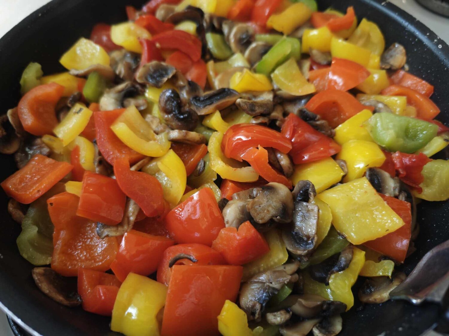 - Na tej samej patelni, na pozostałym smalcu, podsmaż pieczarki, paprykę i marchewkę, a następnie dodaj je do garnka.