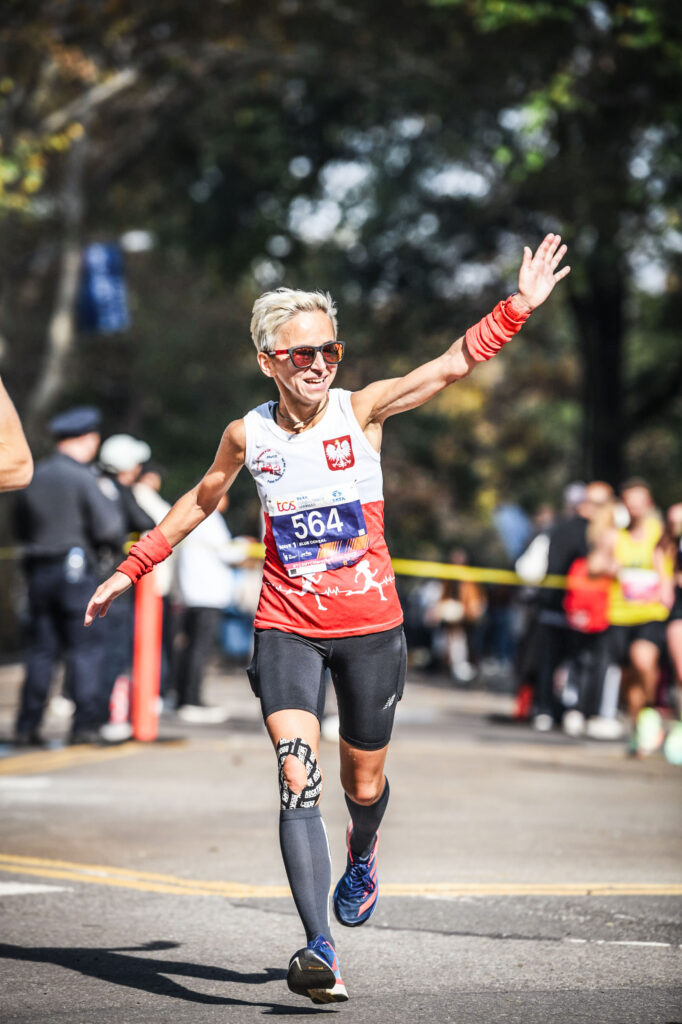 Po 4 tygodniach od maratonu w Chicago wystartowałam w Nowym Yorku. Mój czas jest słabszy niż z Chicago, ale trasa w Nowym Jorku jest dużo bardziej wymagająca i to najtrudniejszy z maratonów z całej serii AbottWMM. Do tego fakt, że to był mój 2 maraton w ciągu miesiąca sprawia, że ten wynik cieszy mnie bardziej. Czas z NY to 2:53:29 i dał mi on pozycje 32 kobiety na mecie na 22776 pań. W kwalifikacji ogólnej dotarłam na metę jako 724 osoba na 51 295 osób, które dobiegły do mety. Gdy myślę sobie, że to tylko 724 miejsce to nie robi to na mnie wrażenia, ale gdy uświadomię sobie, że po mnie na metę dobiegło jeszcze ponad 50 tys. biegaczy, czuję radość. Tak, bardzo cieszy mnie ten fakt. Dodatkowo byłam najszybszą Polką na mecie. W kategorii wiekowej byłam 4 i miałam bardzo mocne konkurentki, których wyniki były poza moimi możliwościami. Dwie z nich to panie, które należały kiedyś do elity a jedna ciągle staruje jako elita. Ja co prawda w tym roku byłam zaproszona do sub-elity, ale jestem totalną amatorką, która zaczęła biegać maratony w wieku 38 lat.