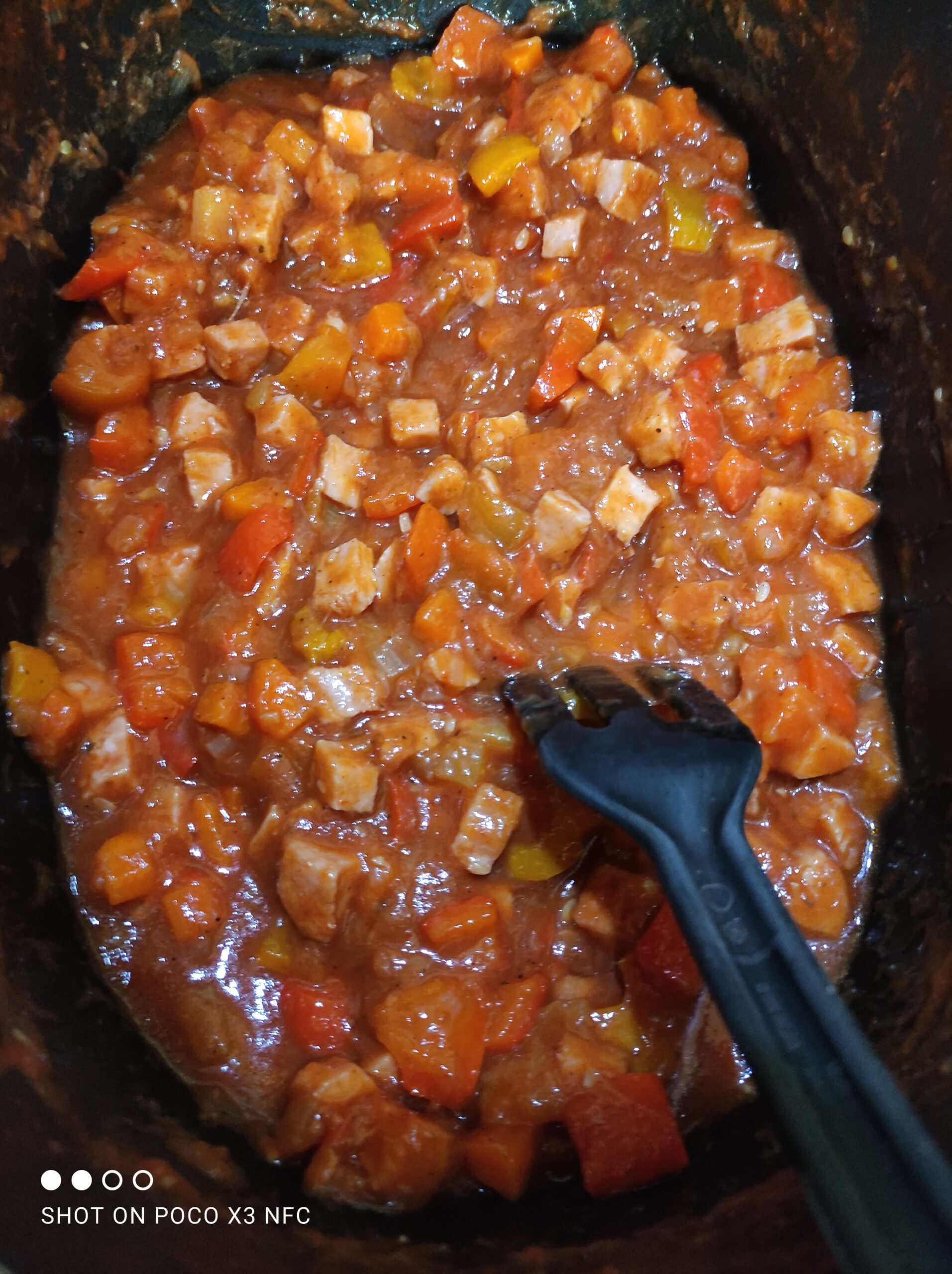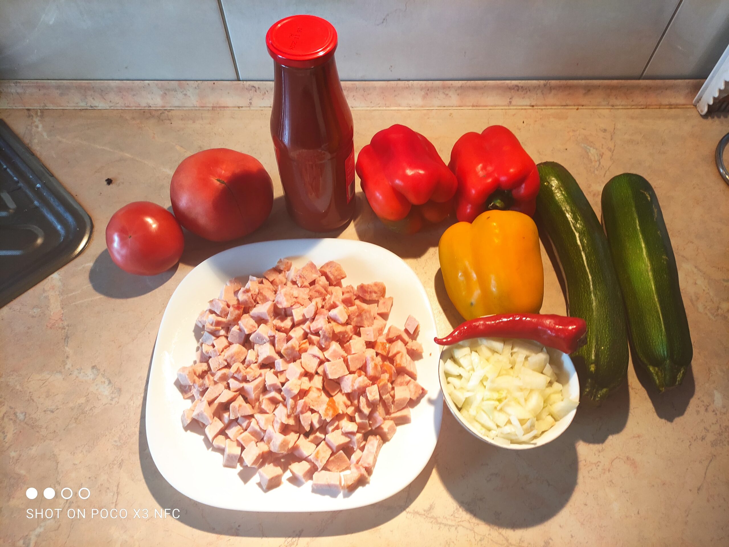 Cebulę wrzucamy do garnka do duszenia „gęsiarki” i podsmażamy na oleju. Gdy się „zeszkli”, ale nie przypali (!!!) dokładamy paprykę i zamykamy pokrywką garnek. Po ok. 15-20 minutach dorzucamy pokrojoną cukinię i pomidory. Dalej dusimy pod przykryciem. Na ostatnim etapie dodajemy kiełbasę i zalewamy wszystko passatą. Jak wszystko się „zagotuje” doprawiamy według uznania.