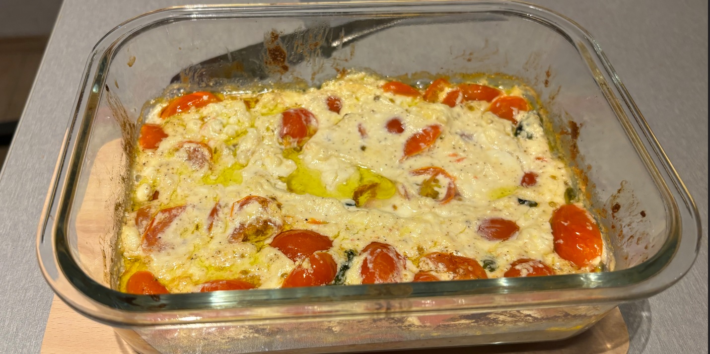 - W naczyniu żaroodpornym umieść pokrojone na połówki pomidorki koktajlowe.