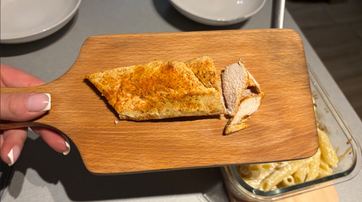 - W międzyczasie pierś z kurczaka przypraw solą, pieprzem i ulubionymi przyprawami. Możesz ją usmażyć na patelni lub upiec w piekarniku.