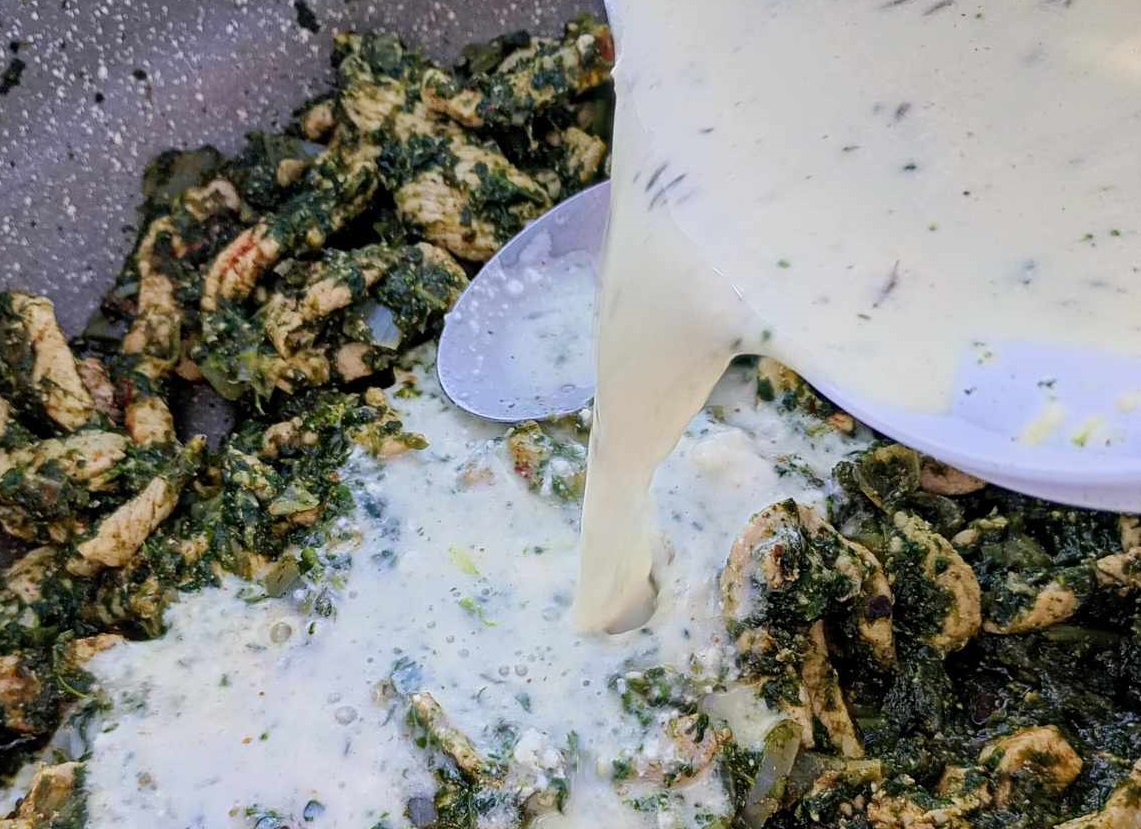 - Zalej całość śmietaną lub jogurtem. Jeśli sos wyjdzie za gęsty – dolej trochę wody, mleka lub bulionu z kostki. Wymieszaj i duś jeszcze 2–3 minuty na małym ogniu, aż zrobi się kremowy sos.