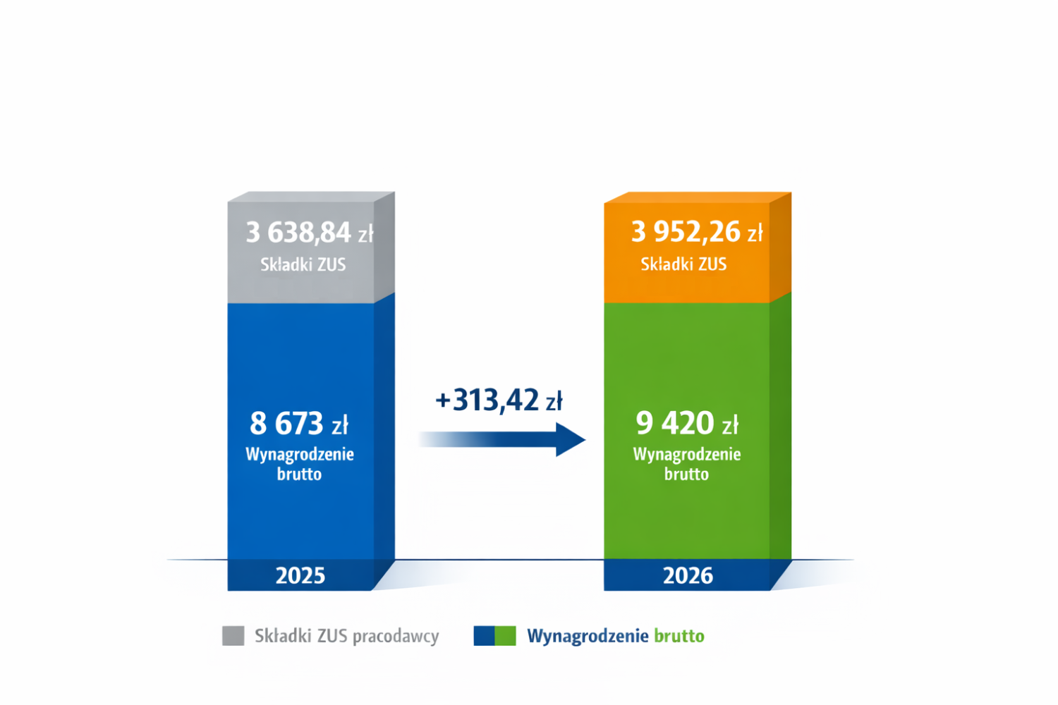 Jak widać przy 8673 zł – składki ZUS 3638,84 zł, a przy 9420 zł – składki ZUS 3952,26 zł. Różnica 313,42 zł.