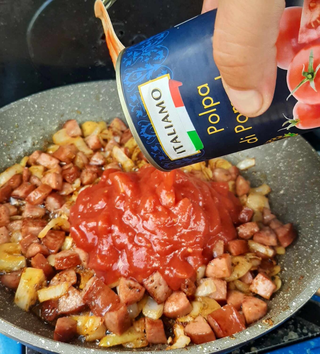 - następnie kiełbaskę z cebulką podsmażam i dodaję pomidory