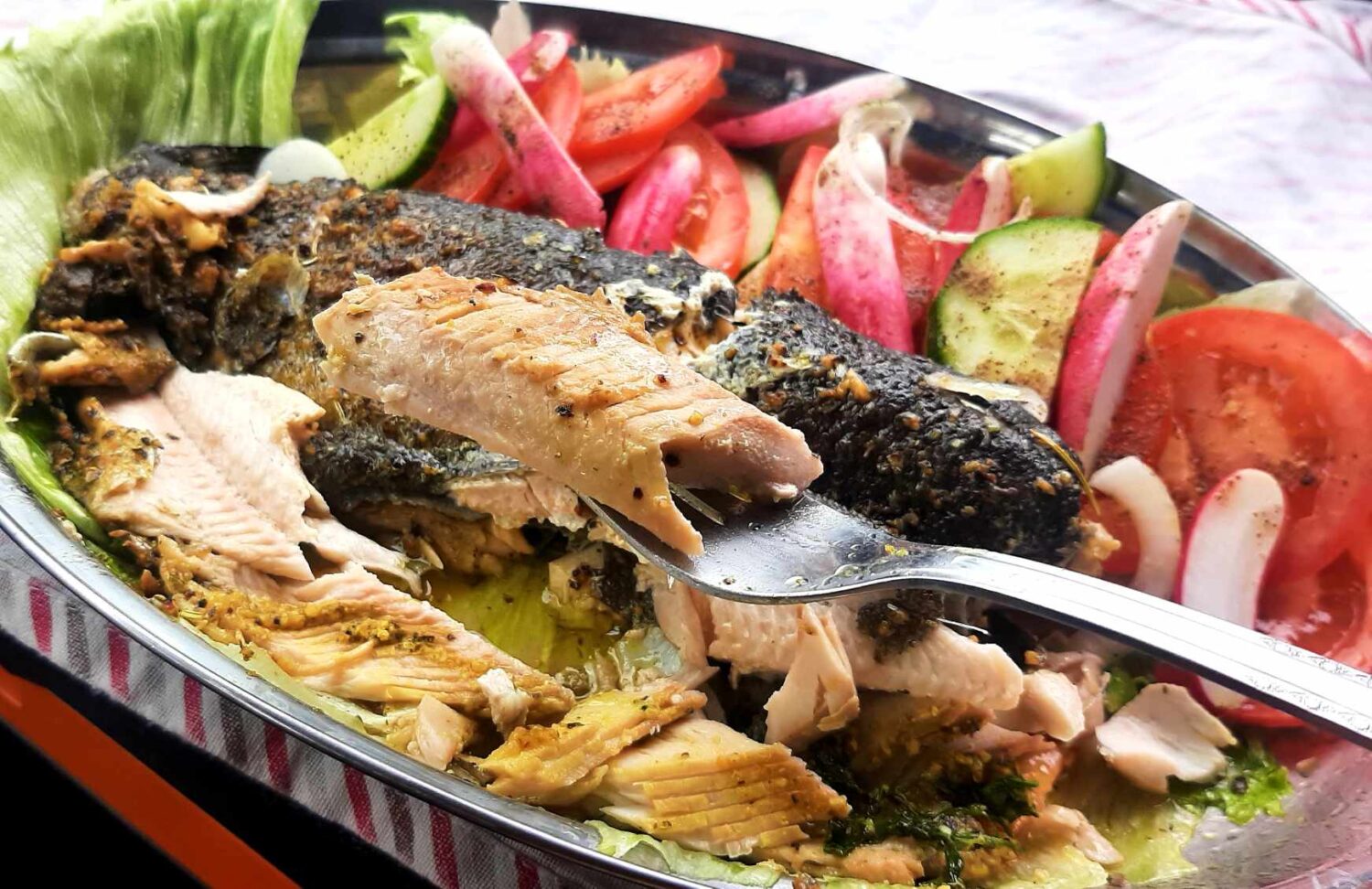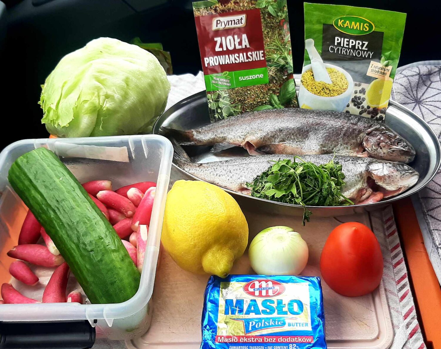 Pstrąga z patelni można podawać np. z bagietką lub frytkami i oczywiście surówką. Najczęściej robię ją z sałaty lodowej, pomidora, ogórka i cebuli.