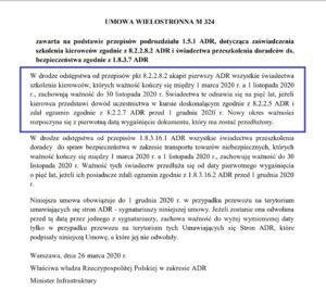 W drodze odstępstwa od przepisów pkt 8.2.2.8.2 akapit pierwszy ADR wszystkie świadectwa szkolenia kierowców, których ważność kończy się między 1 marca 2020 r. a 1 listopada 2020 r., zachowują ważność do 30 listopada 2020 r. Świadectwa te odnawia się na pięć lat, jeżeli kierowca przedstawi dowód uczestnictwa w kursie doskonalącym zgodnie z 8.2.2.5 ADR i zdał egzamin zgodnie z 8.2.2.7 ADR przed 1 grudnia 2020 r. Nowy okres ważności rozpoczyna się z pierwotną datą wygaśnięcie dokumentu, który ma zostać przedłużony.