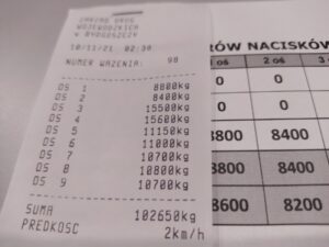 Inspektorzy z kujawsko-pomorskiego ITD postanowili również sprawdzić naciski na osie. Pomimo posiadania przez zestaw aż 9 osi przekroczone zostały dopuszczalne naciski niemal na wszystkich z nich. Potrójna oś ciągnika, zamiast dopuszczalnych 27 ton, wywierała na drogę naciski o wartości 39,5 ton. Naciski wszystkich pięciu osi naczepy również przekraczały dopuszczalne wartości.